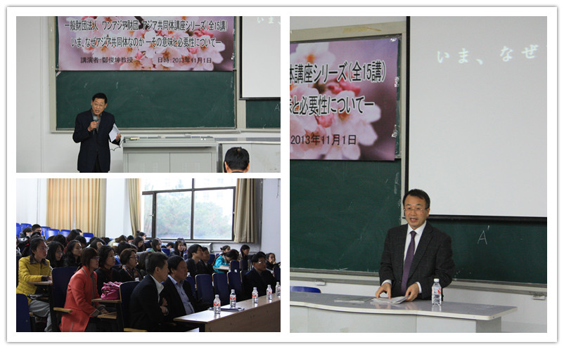 11月1日下午三点半,由外国语学院举办的"亚洲共同体"系列讲座的第三讲在综合楼101教室举行。本次讲座由日语专业权宇教授主持,外国语学院师生听取了讲座。主讲人 “亚洲共同体”首席研究员、明治大学郑俊坤教授作了题为"亚洲共同体的现代阐释"的专题讲座。