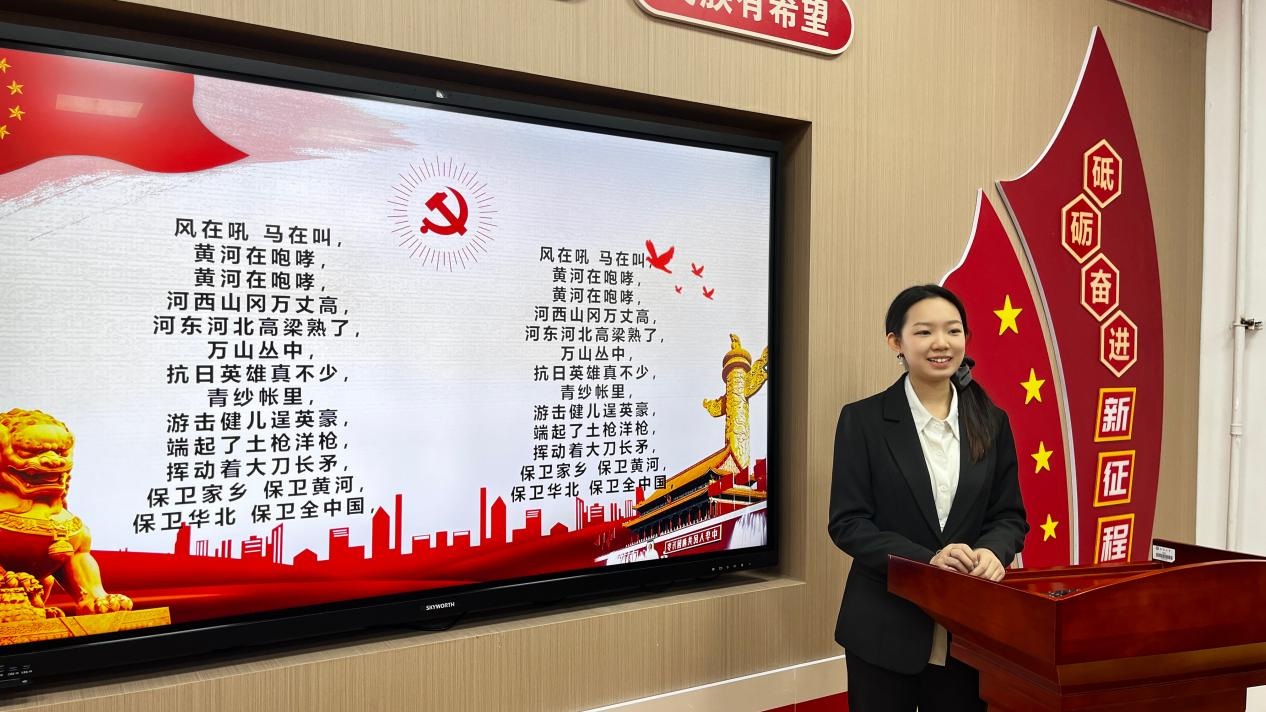 活动以茶话会的形式展开,在温馨而庄重的氛围中,全体党员共同聆听红色经典,感悟百年党史的波澜壮阔。主持人赵一澄在开场中深情指出:“红歌是峥嵘岁月的生动写照,是革命精神的深情礼赞,更是连接历史与未来的情感纽带。”她鼓励同志们透过旋律回望党史,从中汲取源源不绝的精神力量。