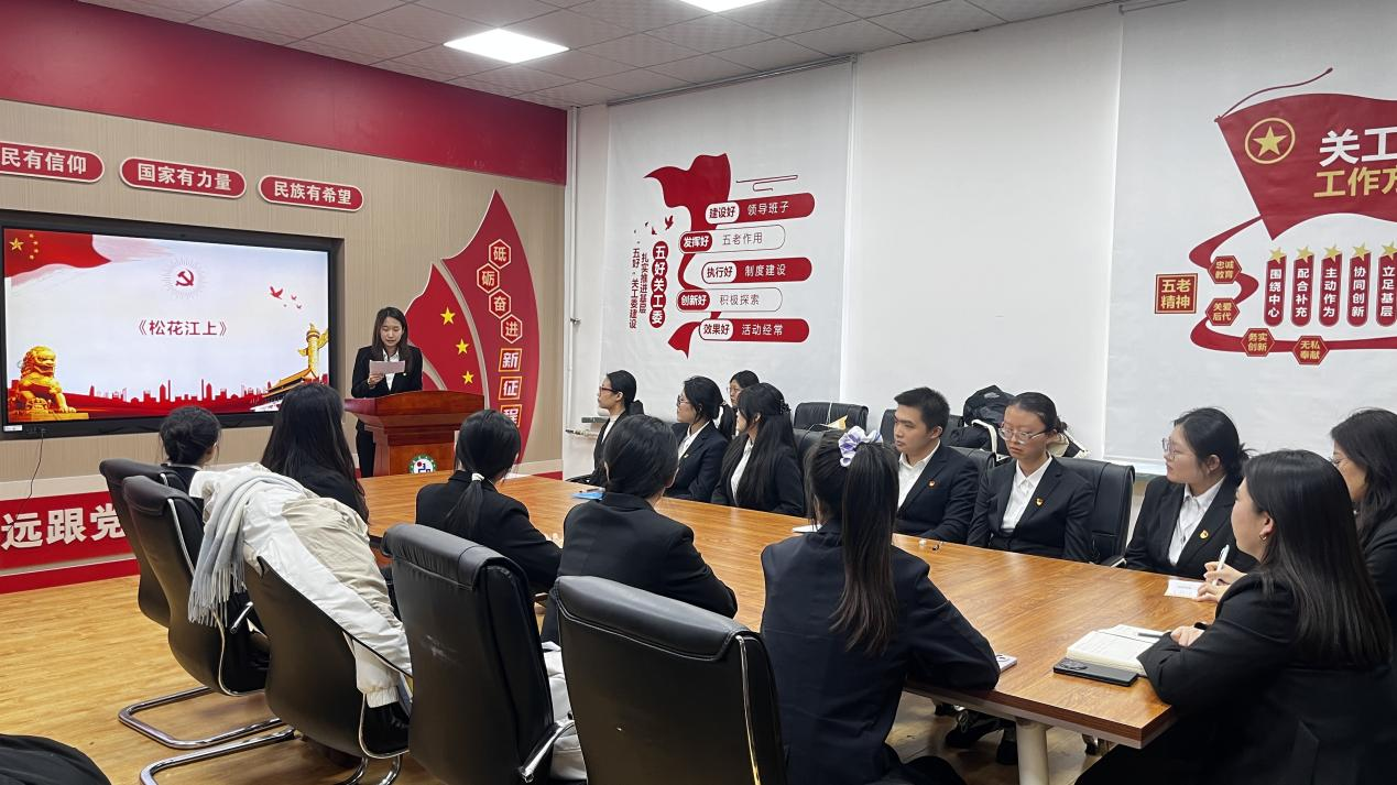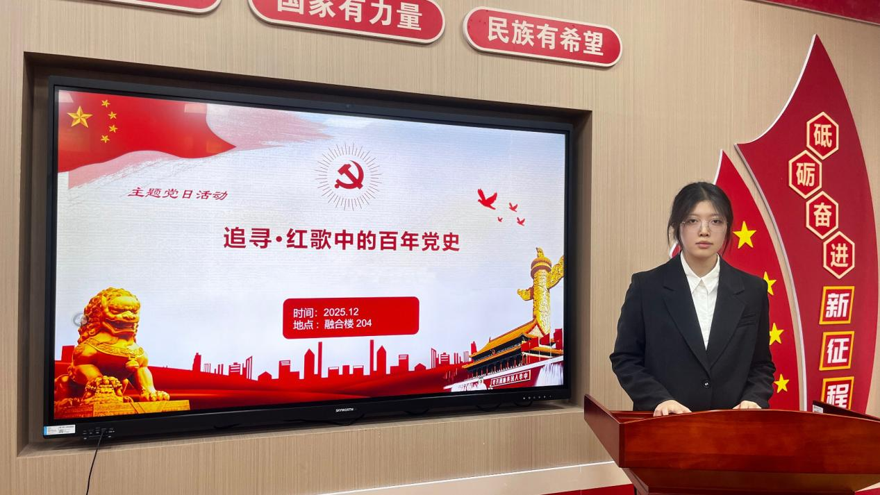 活动中,五名学生党员依次分享了五首具有时代意义的的红色歌曲及其背后的党史故事。刘彦彤同学带来《松花江上》,讲述了“九一八”事变后人民的屈辱与抗争;孔爱嘉同学分享《在太行山上》,重现抗日战争军民一心、同仇敌忾的感人画面;佟思慧同学以激昂的《保卫黄河》,展现中华民族不屈不挠的英勇斗志;孔泓杰同学通过《没有共产党就没有新中国》,深情重温党与人民血脉相连的深厚情感;郝忆萍同学则结合自身专业,解读了延边红色歌曲《红太阳照边疆》中蕴含的民族情怀与建设祖国的炽热激情。