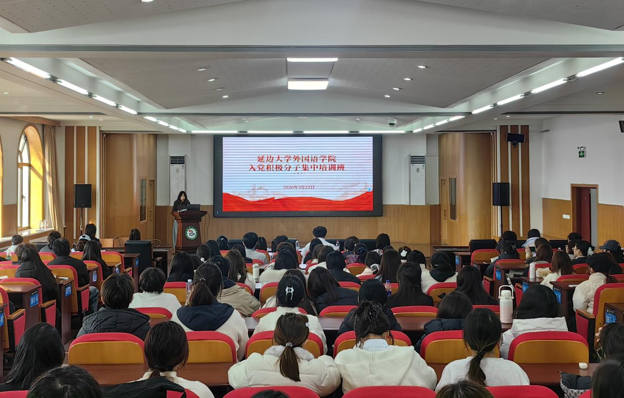 为深入学习贯彻习近平新时代中国特色社会主义思想,进一步强化入党积极分子的理论武装,筑牢思想根基。3月21日,延边大学外国语学院在求真楼7楼会议室举办2026年入党积极分子集中培训班。本次培训邀请到了中共延吉市委党校郑海霞、杨鹤及学院党委书记徐炳煊进行授课,校党委专职组织员金玉丹、外国语学院党委组织员兼党办主任郭鲜丹出席培训,培训由学院党务办公室李一冰主持。