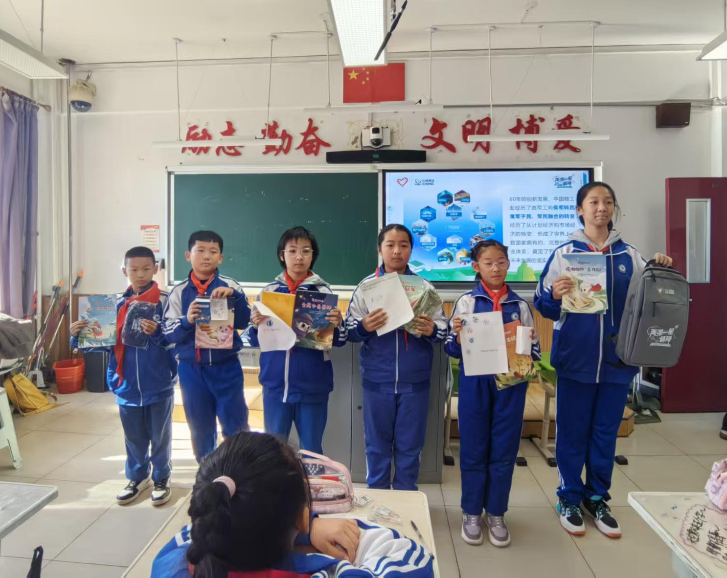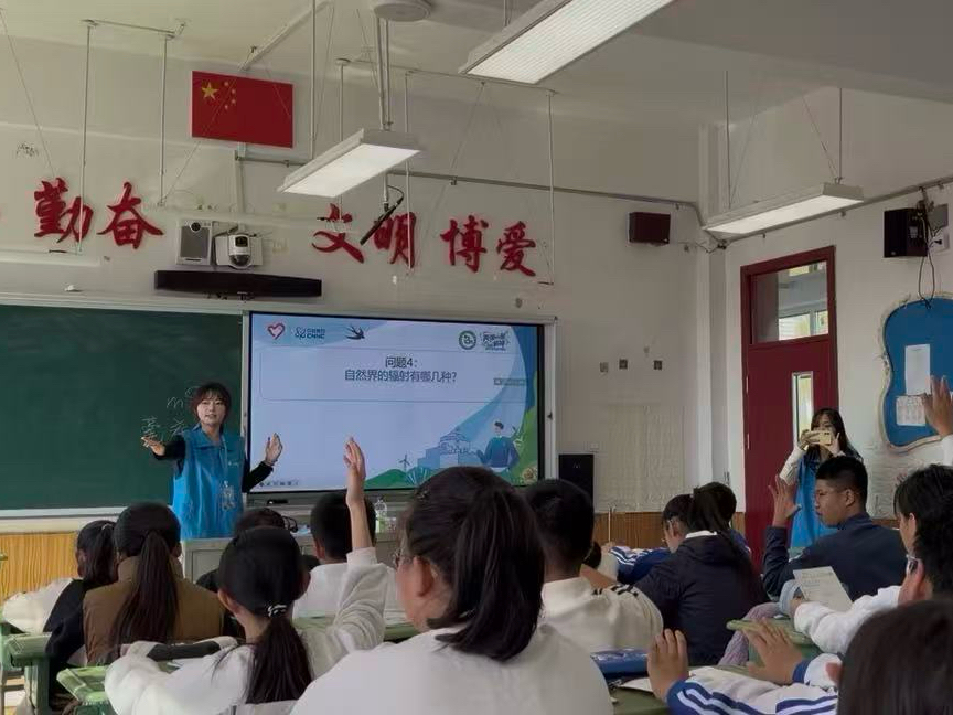 针对初中部学生的认知特点,“承星弹之志,展延大之荣”宣讲团以“深化科学认知,筑牢理想根基”为导向,采用“知识讲解+视频观看+互动问答+总结”的系统化形式,围绕辐射种类、生活应用与安全防护展开深度科普。宣讲中,团队巧妙结合“两弹一星”研制历程中的科学家故事,将“大力协同、无私奉献”的精神内核融入核科技知识讲解:从核电站如何为社会提供清洁能源,到核技术在医疗、农业中的应用,再到科研工作者为突破技术封锁所付出的努力,让同学们在了解核科技价值的同时,深刻体会“国家科技自立自强”的重要意义。现场踊跃的互动问答、充满仪式感的奖品发放与集章留念,不仅强化了知识吸收,更让“热爱祖国、勇担使命”的信念在青少年心中逐步扎根。