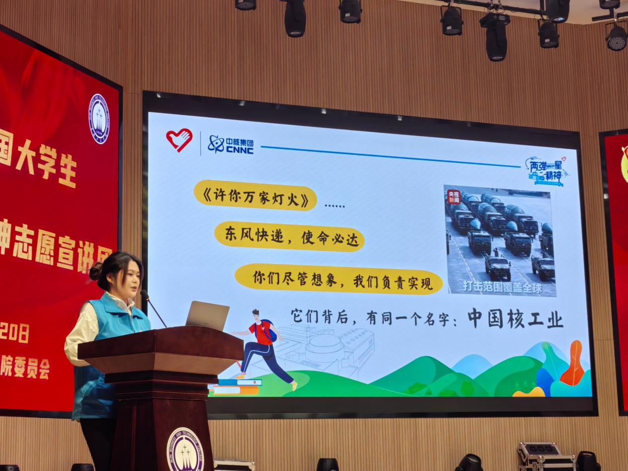 宣讲活动下半场,“承星弹之志,展延大之荣”宣讲团的宣讲员将重点聚焦我国现代核工业与核科技的发展成就,围绕安全、医药、军事等重点核心领域,详细阐述了核科技为国家发展与人民生活带来的切实贡献:在安全领域,核技术为能源安全、环境监测提供了有力支撑;在医药领域,核医学技术助力疾病诊断与治疗水平提升,守护人民健康;在军事领域,核科技的突破为国家国防安全筑牢了坚实屏障。一系列详实的案例与数据,不仅让现场师生直观感受到核科技的重要价值,更生动展现了在高科技时代背景下,中国科研实力跻身世界一流水平的雄厚底气与卓越风采。