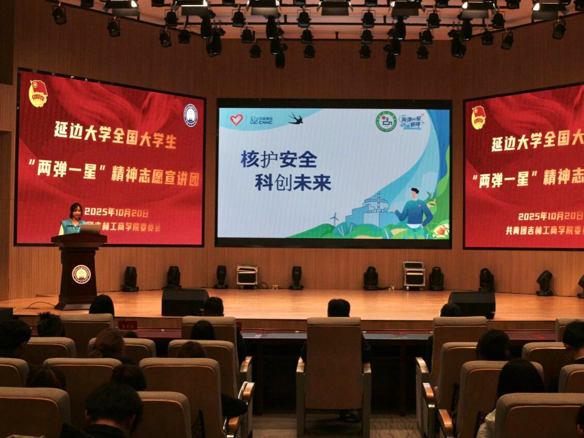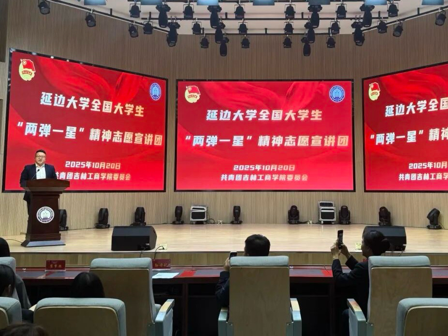 为深入挖掘“两弹一星”精神的时代内涵,引导青年学子厚植家国情怀,2025年10月20日下午,延边大学外国语学院“延青励剑志愿团”与“承星弹之志,展延大之荣”宣讲团联合走进吉林工商学院,开展了一场主题鲜明、内容丰富的宣讲活动。