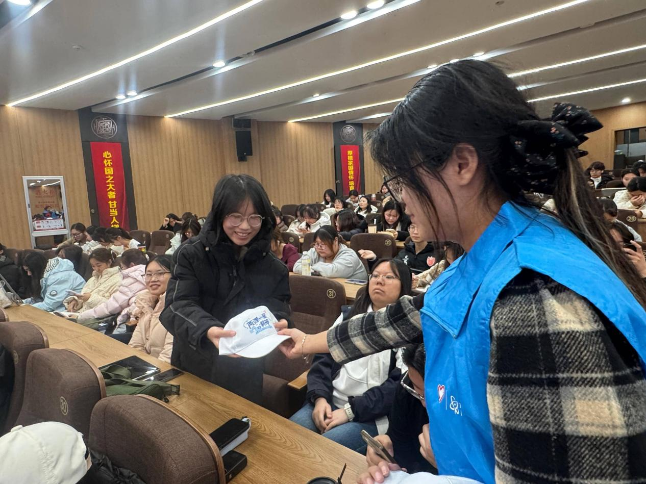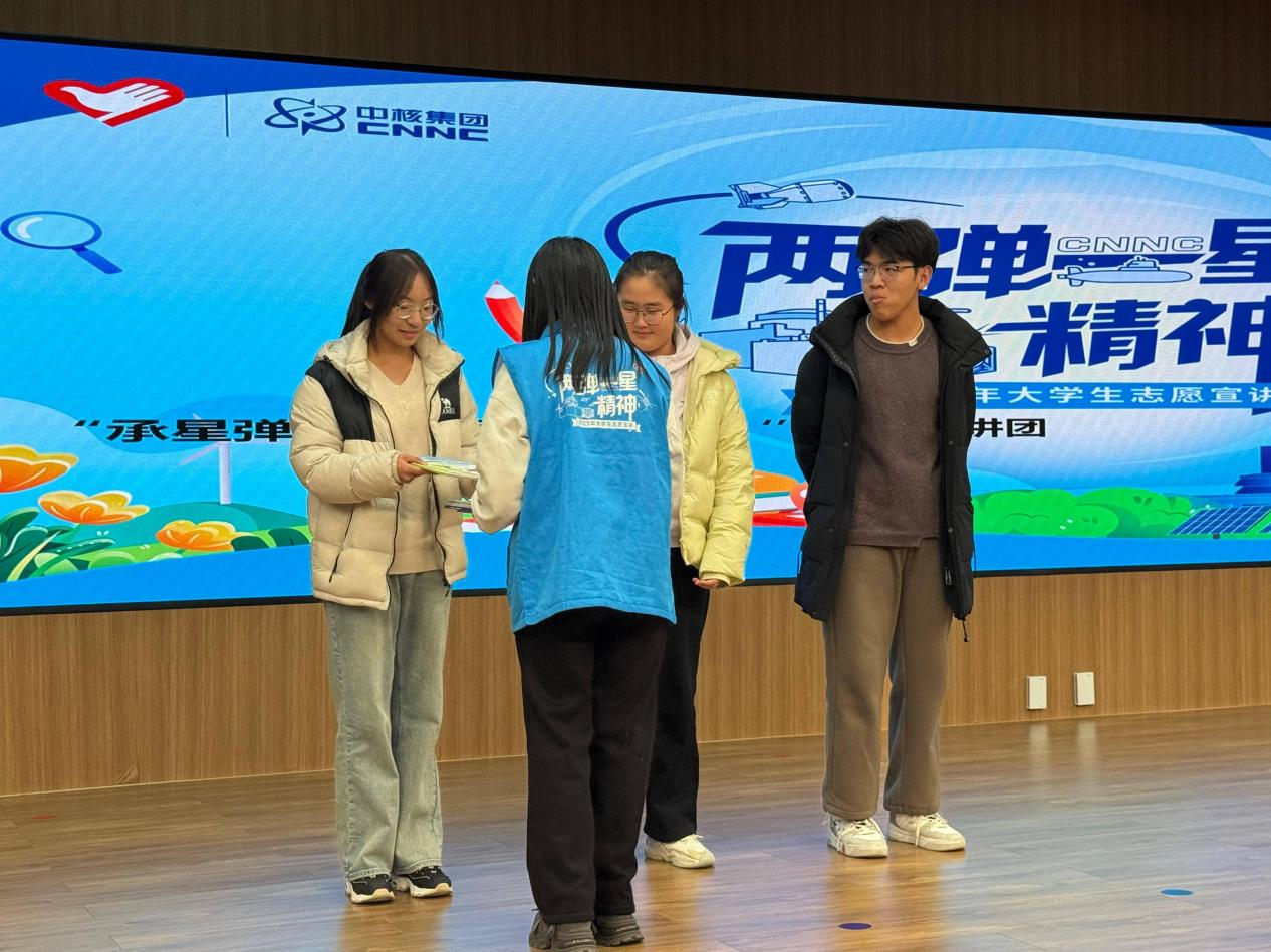 活动从充满仪式感的趣味盖章环节拉开帷幕。印有“以身许国”“科技报国”“薪火延大”等字样的彩色印章整齐陈列,同学们手持活动手册有序驻足,郑重盖上象征精神传承的印记,在交流分享中传递对“两弹一星”精神的初印象,现场活力与期待交织,为红色之旅奠定温暖基调。宣讲环节中,双语版《梦想的远征》MV缓缓播放,“小皮球”承载的童年记忆、“马兰”戈壁的苍茫壮阔、核爆成功的欢呼场景,搭配激昂旋律瞬间将学子拉回峥嵘岁月;随后宣讲人周怿乔结合图文并茂的PPT,生动再现“两弹一星”元勋隐姓埋名、扎根戈壁的奋斗历程与核爆震撼瞬间,邓稼先等先辈“干惊天动地事,做隐姓埋名人”的赤子之心,让不少同学眼眶泛红。互动环节更成为思想碰撞的舞台,围绕“‘两弹一星’精神的时代意义”“科技报国实践路径”等问题,学子结合专业特色踊跃发言,朝鲜语专业学生提出“用多语种传播核科技故事”、理工科学生倡议“从基础学科钻研做起”,真挚见解赢得阵阵掌声,工作人员为发言者送上定制文创礼品;抽奖环节通过大屏幕小程序抽取幸运学子,定制徽章、主题帆布包、元勋语录明信片等礼品的送出,让精神传递更具象可感,将现场气氛推向高潮。