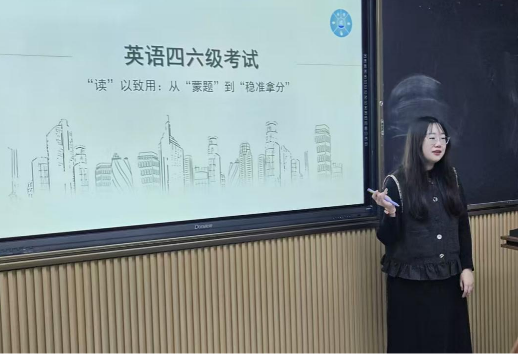 贾丹阳老师毕业于英国曼彻斯特大学国际教育学专业,持有剑桥大学TKT五项教学证书,并曾获雅思阅读8分的优异成绩。讲座中,她围绕四六级阅读题型展开系统讲解,全方位剖析阅读重难点题型,分享突破词汇壁垒的方法,帮助学生掌握多主题学术单词的记忆与运用技巧。贾老师还结合自身教学与应试经验,为学生规划科学的四六级备考路径,提供实用的时间管理与复习策略。