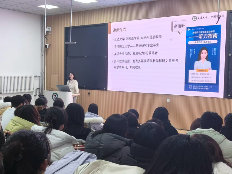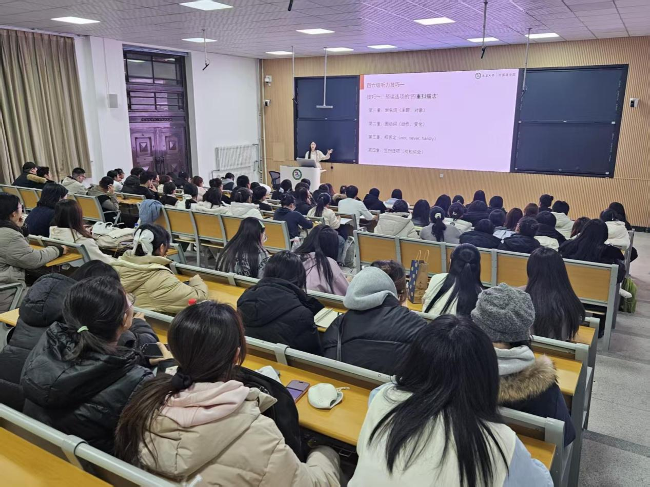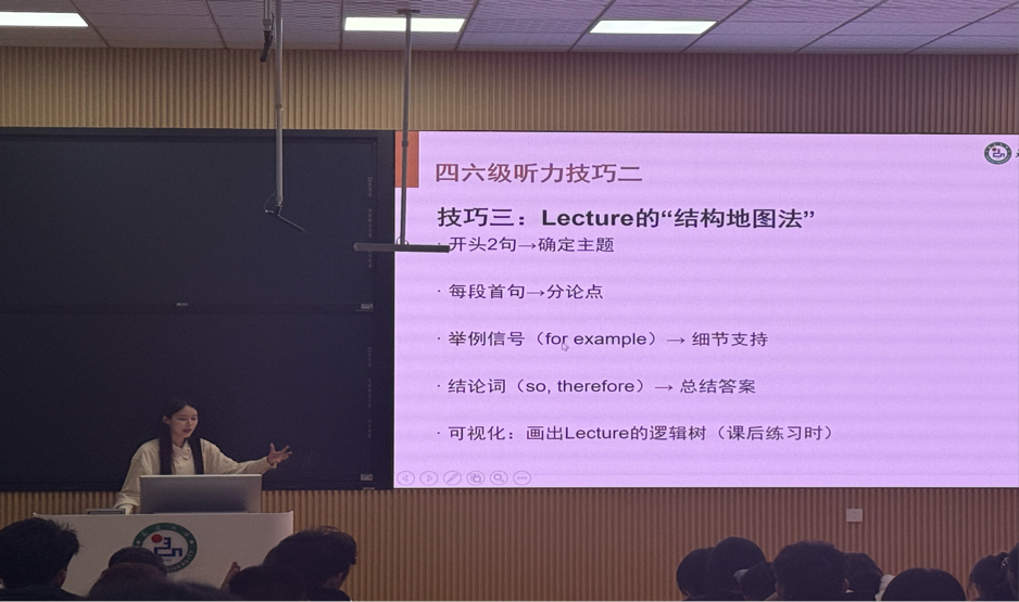高语轩老师毕业于香港理工大学英语研究专业,是雅思听力8分高分获得者,兼具扎实的专业功底与丰富的教学经验。讲座中,她围绕四六级听力不同题型展开系统拆解,精准剖析听力考查重难点,分享突破听力理解障碍的实用方法,帮助学生掌握语音辨听、信息抓取、逻辑分析的核心技巧。高老师还结合自身教学与应试经验,为学子规划科学的听力备考节奏,提供针对性的日常训练与时间管理策略。