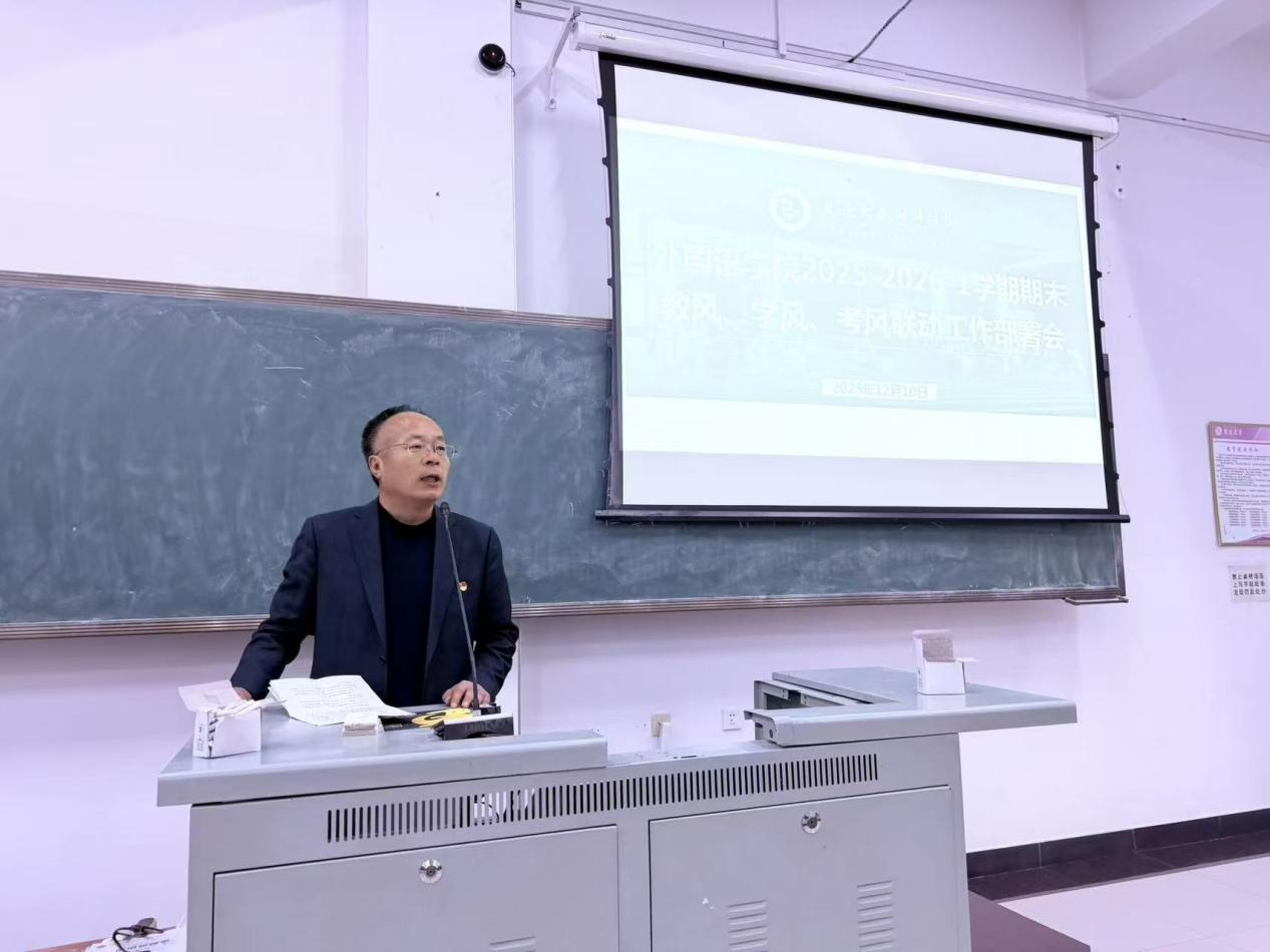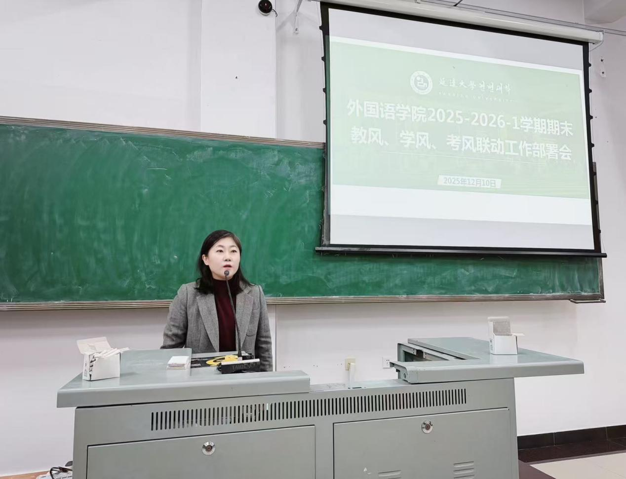 12月10日下午,延边大学外国语学院召开2025-2026-1学期期末教风、学风、考风联动工作部署会。学院党委书记徐炳煊、院长朴银姬、副书记郑仁顺、副院长刘一出席会议,学院全体教师参加会议。会议由副院长刘一主持。