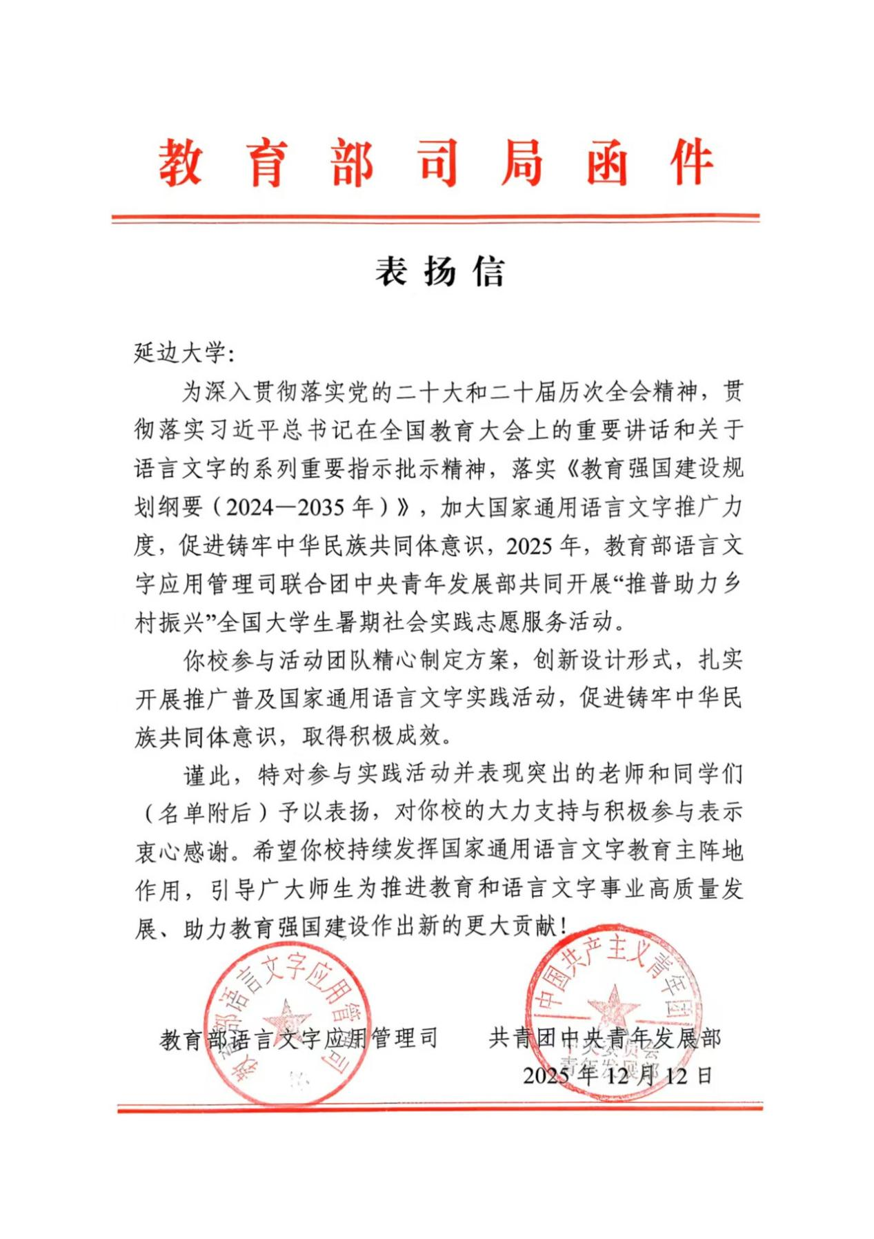 此次“优秀团队”荣誉的斩获,是教育部、团中央对延边大学外国语学院实践育人工作的高度认可,更是对团队成员扎根基层、服务社会的青春实践的充分肯定。未来,延边大学外国语学院将进一步深化推普助力乡村振兴实践项目,持续完善“理论+实践+服务”的社会实践育人体系,鼓励更多青年学子走出校园、扎根基层,奋力书写国家通用语言文字推广与乡村振兴协同发展的崭新篇章!