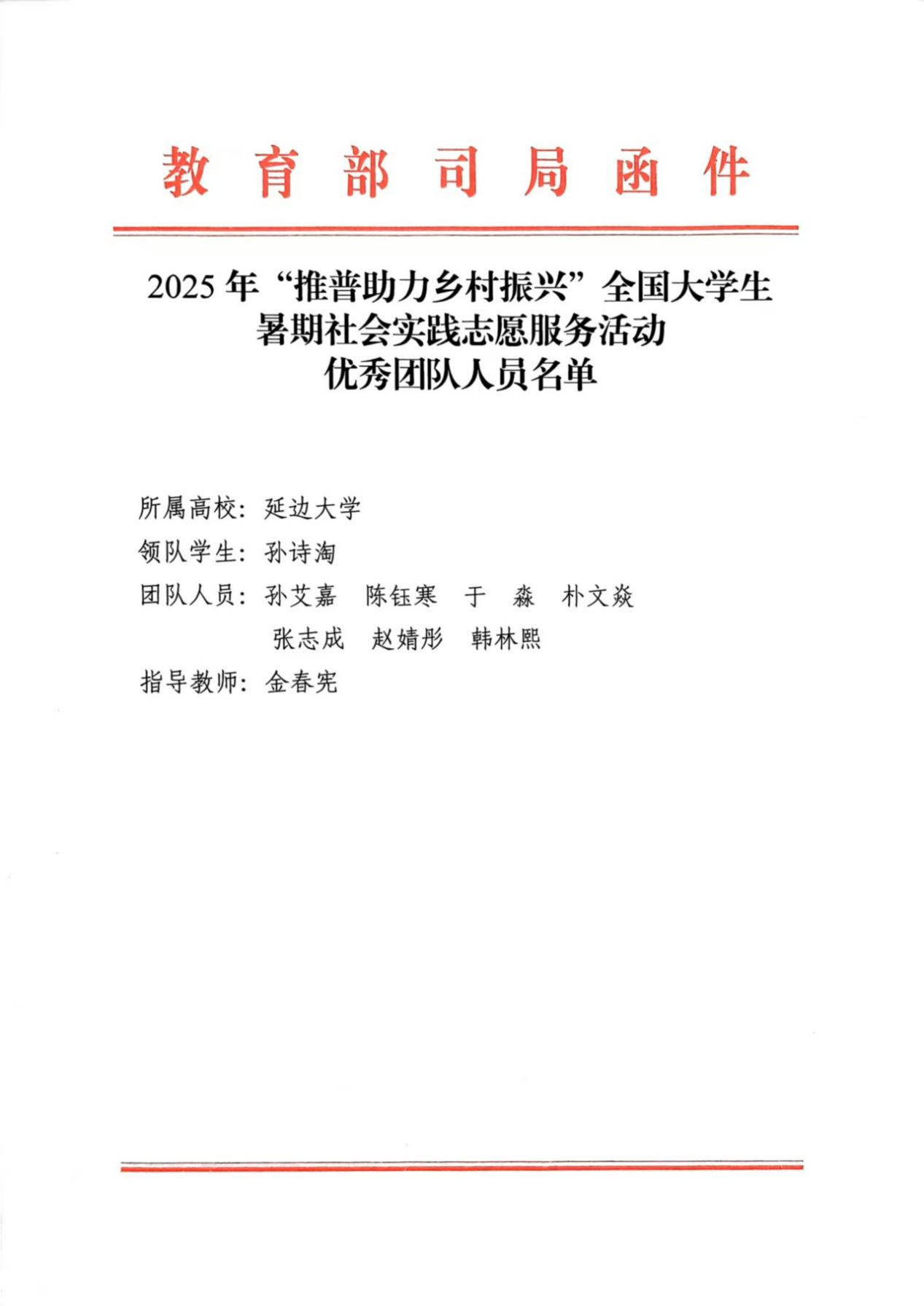 近日,由教育部语言文字应用管理司、团中央青年发展部联合主办的2025年全国大学生“推普助力乡村振兴”暑期社会实践志愿服务活动评选结果正式揭晓。延边大学外国语学院“乡音筑梦”推普实践团凭借扎实深入的实践成效、独具匠心的服务模式与矢志不渝的青春担当,从全国众多参赛团队中脱颖而出,成功斩获“优秀团队”荣誉称号,为学校与学院赢得了殊荣。