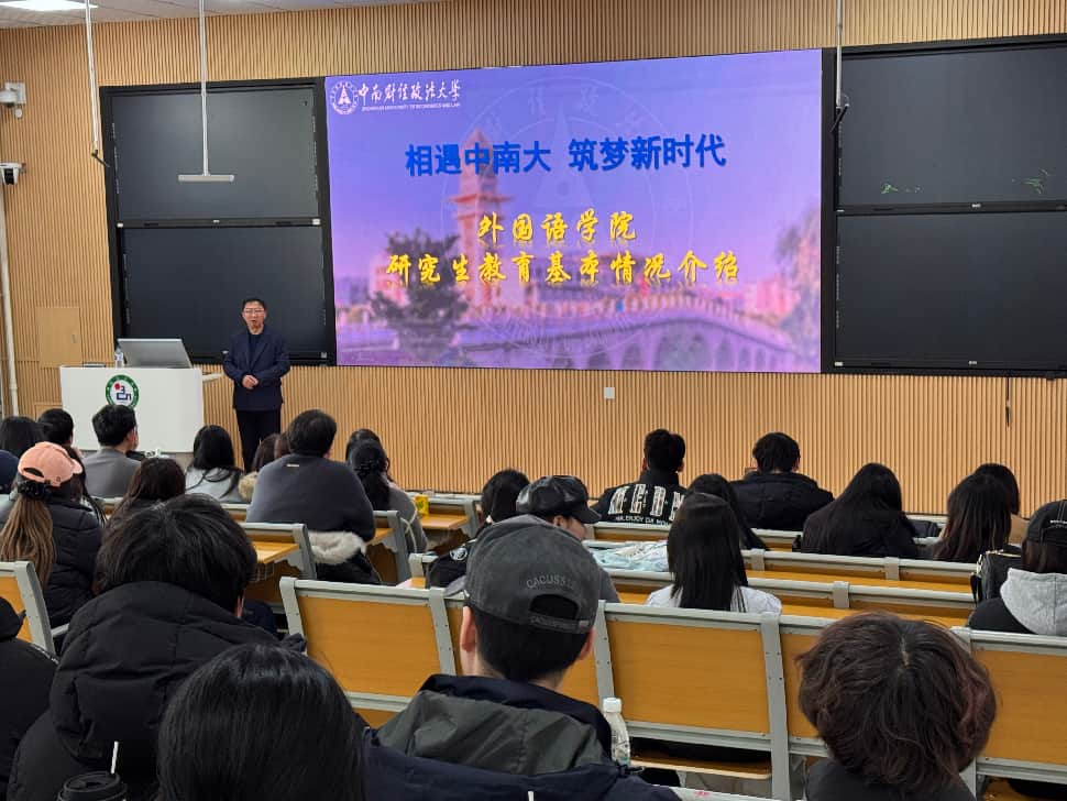 为助力大三学子明晰考研方向、拓宽升学视野、科学规划学业与职业发展路径,3月20日,外国语学院精心举办2023级英日俄专业考研升学专场宣讲会。本次宣讲会特邀中南财经政法大学外国语学院王革教授担任主讲嘉宾,学院教授委员会主任南成玉、刘殿萍教授出席活动,宣讲会由学院团委书记金春宪主持。
