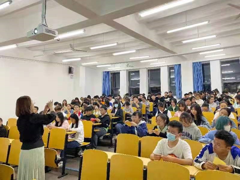 最后,郑老师为新生们的大学生活提出了建议,鼓励新生们像尼克•胡哲一样永不放弃、自立自强,引导同学们思考自己大学将要完成的五个目标,并将这五个目标写在彩纸上,折成心形,旨在让同学们主动思考规划自己的大学生活,实现大学生活从“心”开始。