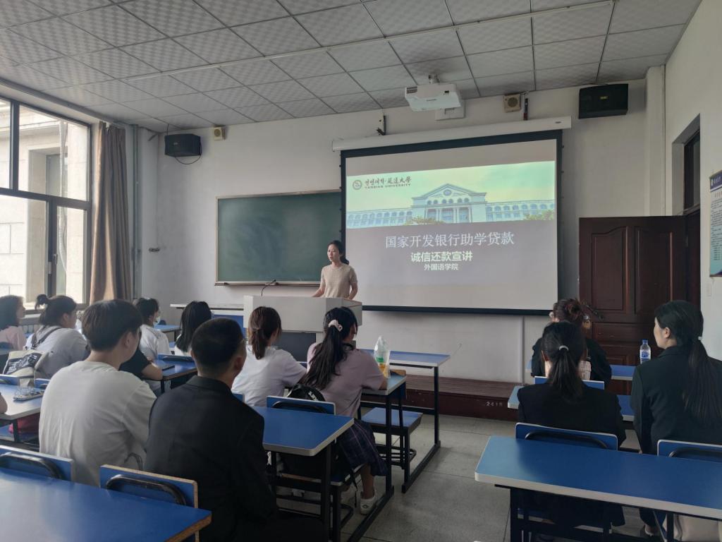 为落实国家有关高校资助政策和我校相关文件精神,本着认真、负责的态度,外国语学院针对本院学生开展多种形式的教育工作,6月4日下午,外国语学院在综合楼113b进行了在校生生源地信用助学贷款资助宣讲会,学生工作办公室金兰老师及各个专业班委、学生干部参加了此次宣讲会。