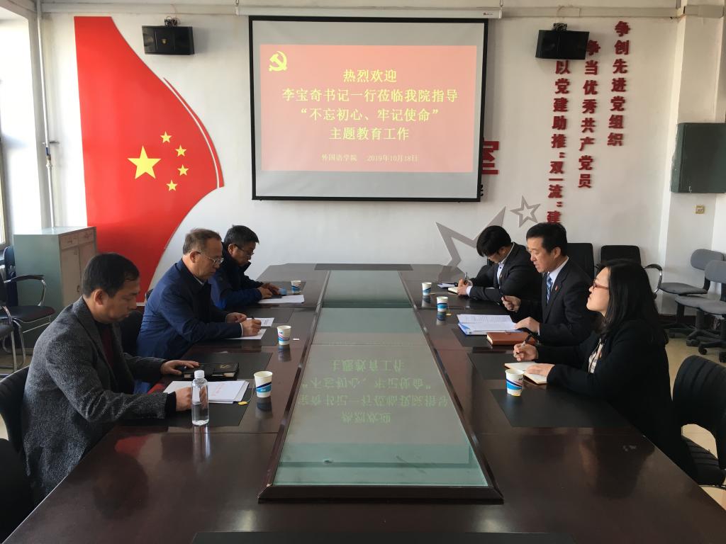 2019年10月18日上午10:00,校党委副书记李宝奇一行莅临外国语学院对“不忘初心、牢记使命”主题教育工作进行指导。学院党委书记全永男、副书记裴香花、党委办公室主任李仁哲等参加了会议。