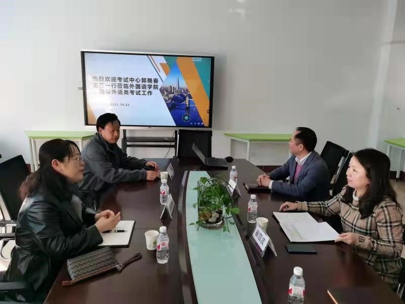 2021年10月22日下午,延边大学考试中心主任郭艳春和原主任王海民到外国语学院针对全校外语类考试工作进行了交流与座谈。外国语学院院长崔雪波、副院长金明浩、院办主任王群参加了本次活动。