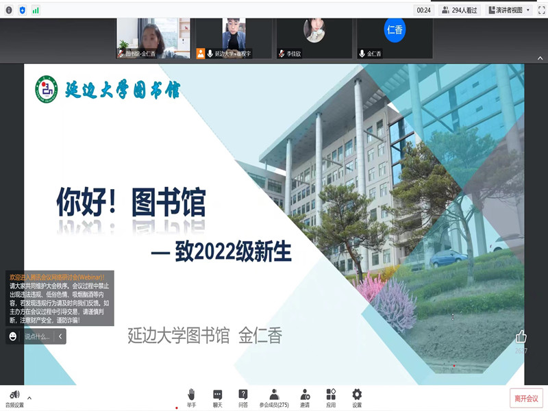讲座伊始,金老师首先对图书馆概况进行了介绍,从环境、发展历程以及馆藏资源等方面,向同学们介绍了学校现存的三大图书馆——逸夫图书馆、科技图书馆和珲春校区图书馆,使同学们对图书馆有了初步的认识。随后,金老师为同学们重点讲解了图书馆的各项规定和要求,馆藏及分布,以及图书的排架规律、索书号等知识,使同学们在日常使用中能更加顺利地入馆借阅,更好地激发同学们的自主学习兴趣。除了在图书馆馆内查阅书籍,同学们还可通过图书馆官方网站、公众号等方式检索书籍。金老师通过线上共享屏幕的形式,示范如何在线检索书籍,并为同学们展示如何运用图书馆的数字资源。最后,金老师鼓励新生,希望同学们能够充分利用好学校图书馆的各类资源,来完成自己的学业,以梦为马,不虚度年华。