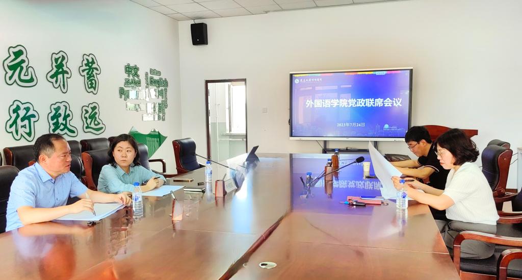 2023年7月24日下午,在融合楼333会议室,外国语学院召开了第一次党政联席会议。外国语学院院长朴银姬、副书记金明浩、副院长崔一、副院长安勇花参加了会议,会议由外国语学院院长朴银姬主持。