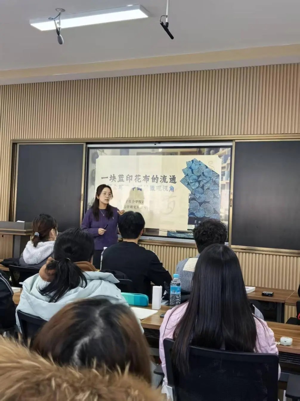 讲座中,汪丹副教授强调“微观研究的学术价值”,以传统手工艺蓝印花布为微观切口,梳理了一块蓝印花布从江南村落的染坊,通过各国人民之间的交往流动于东亚、东南亚、欧洲市场的流通链条,一方面拆解了全球化背景下文化符号的生成与流动机制,另一方面也提示了由微小物质观察宏观世界的方法论借鉴。